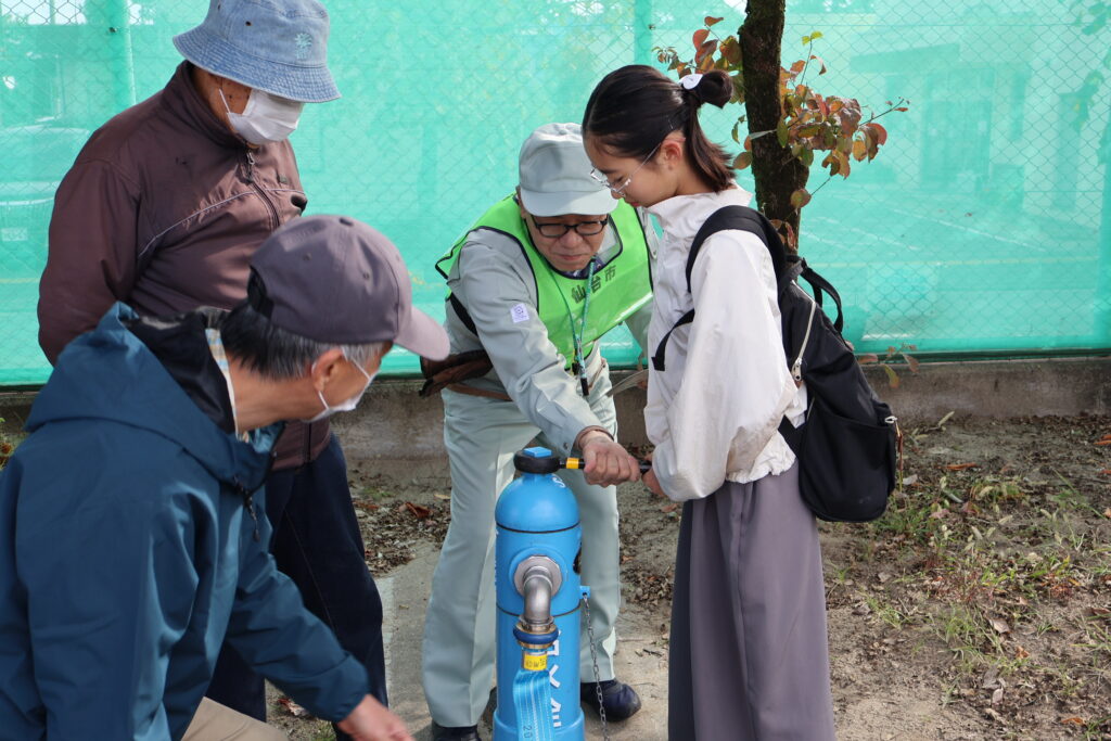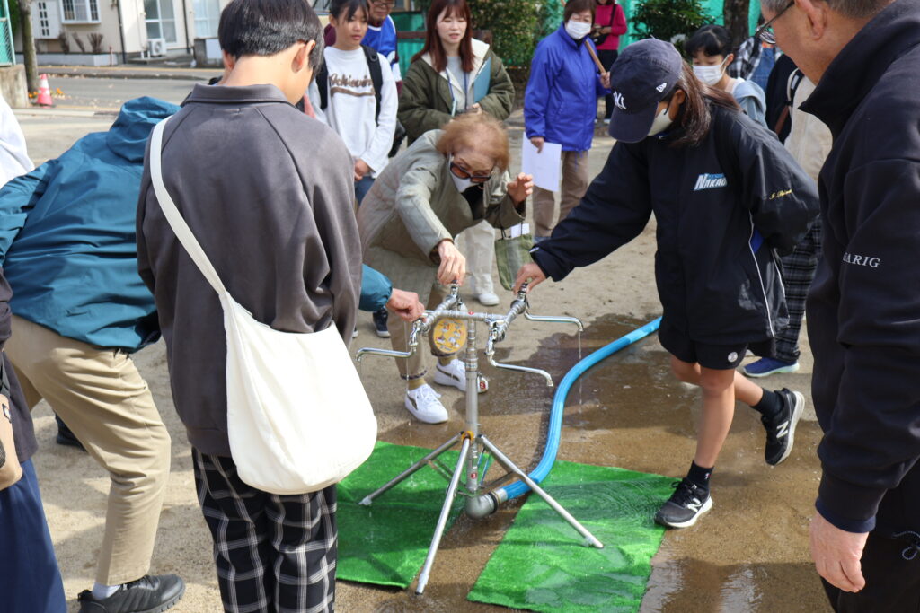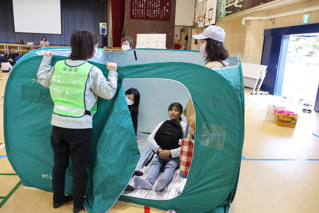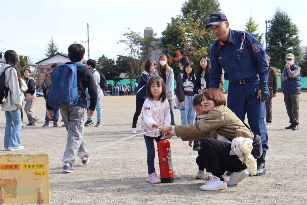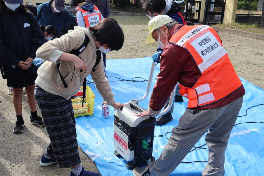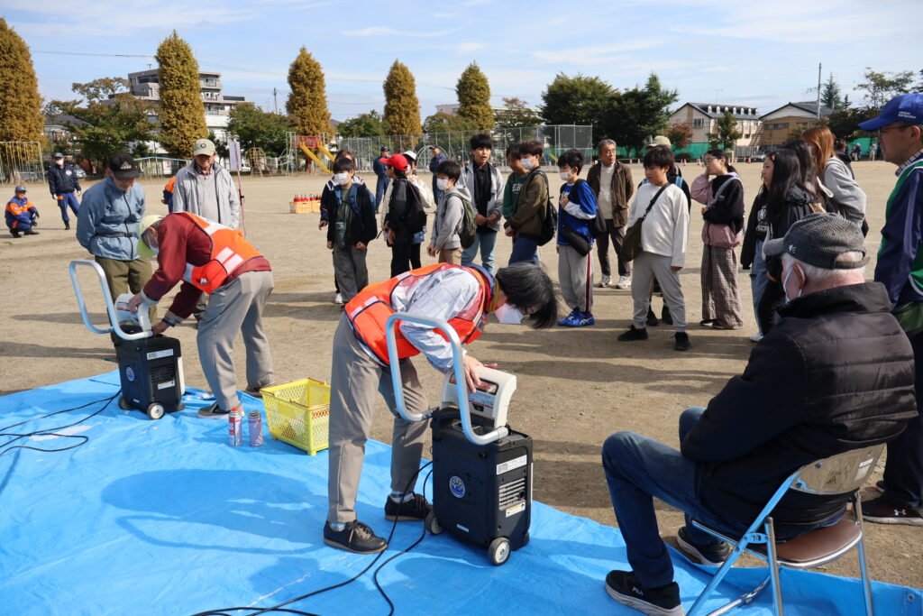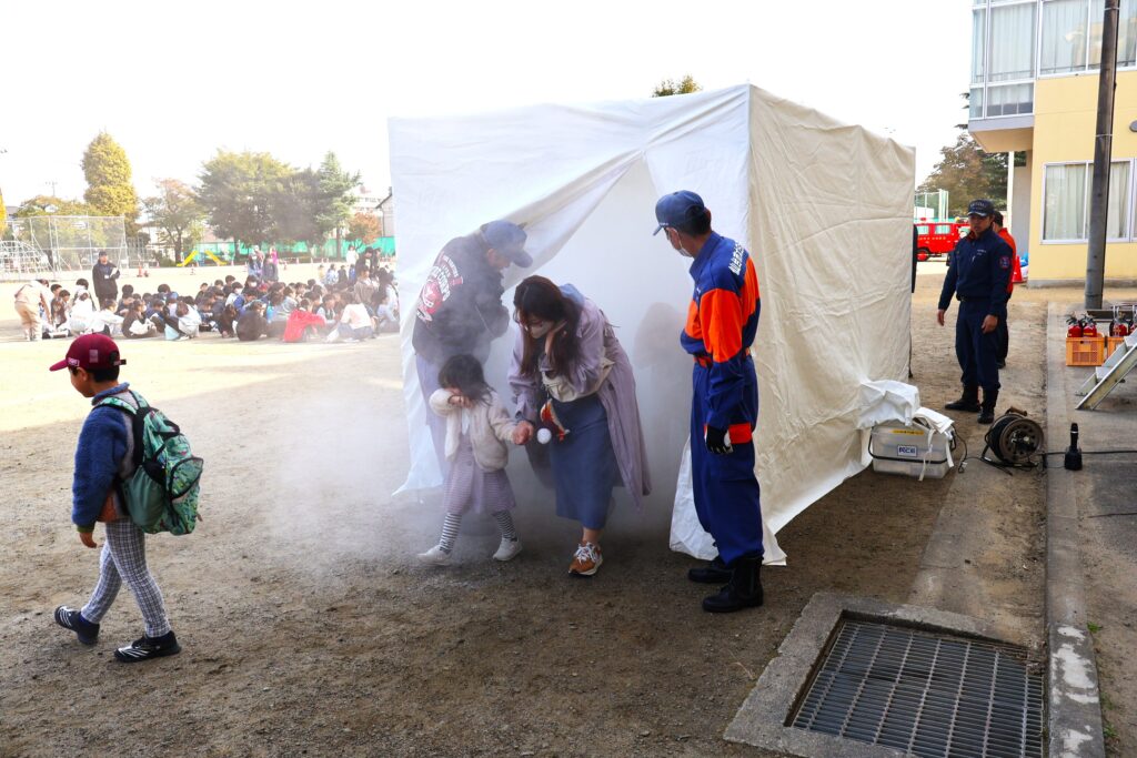 大地震が発生したという想定の下、柳生中学校区の地域・学校合同防災訓練が10月25日に実施され、地域住民と西中田小学校の児童、保護者など約500人が参加ました。いっとき避難所の確認や指定避難所(西中田小学校)への移動のあと、子どもたちと住民が4班に分かれ、濃煙体験、初期消火や給水栓の使い方、簡易発電機の操作、避難所での簡易パーテーションの組み立てなどに取り組みました。今回初めて訓練に参加したという女性は「東日本大震災のときは石巻で被災したので記憶が鮮明です。今回の訓練参加を契機に防災への備えを新たにしたいと思います。」と話していました。